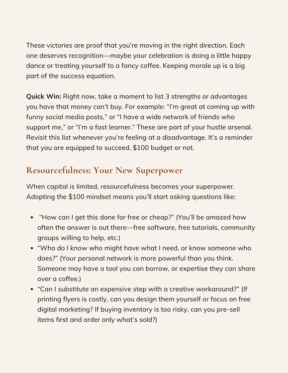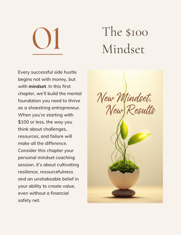 Learn how to replace fear with confidence and scarcity with creativity. This chapter builds the mindset that helps you start β even when money is tight.
