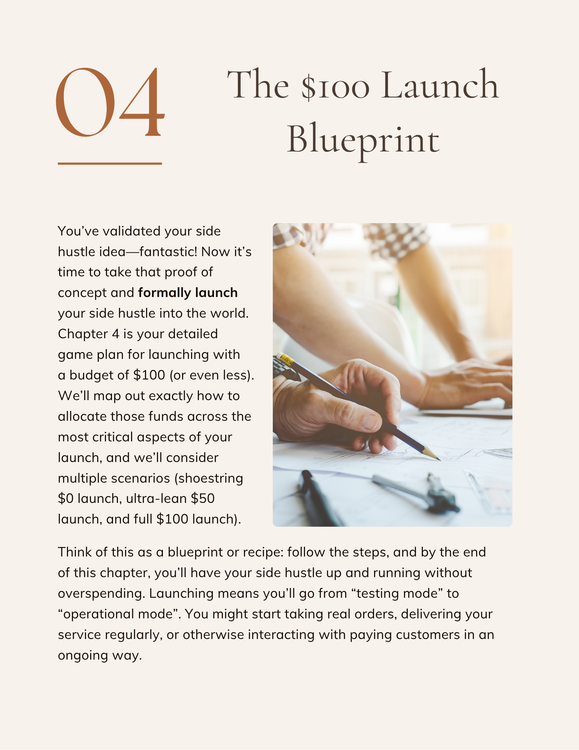 Follow a simple, step-by-step launch blueprint designed to get your side hustle up and running on a shoestring budget β without wasting a single dollar.